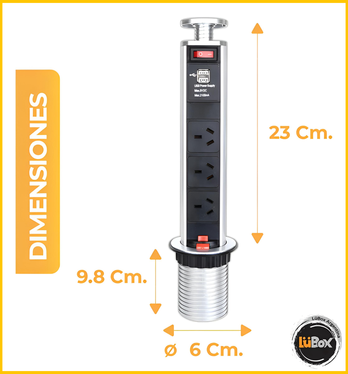 - Tomas de Corriente: 3 tomas de corriente más 2 puertos USB de carga rápida 2A para cargar múltiples dispositivos simultáneamente.
