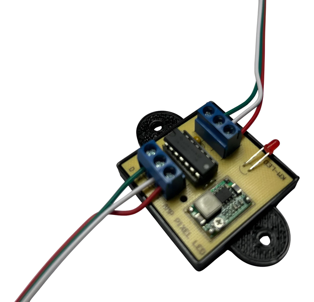 La placa cuenta con un Logic level shifter SN74ACHT125N para amplificar la señal de tus pixel led cuando estas teniendo problemas.