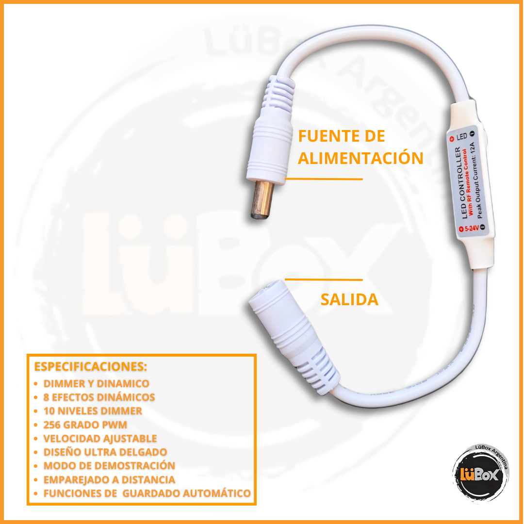 Combinamos el mini dimmer con un control remoto RF, una forma más conveniente de lograr el mejor efecto visual de su tira LED. Este mini dimmer es de pequeño tamaño, lo que facilita ocultarlo. Mediante la conexión de tiras LED, junto con el control remoto RF podrá controlar la tira para lograr diferentes funciones, como el modo dinámico, el nivel de velocidad dinámico y el ajuste de brillo.