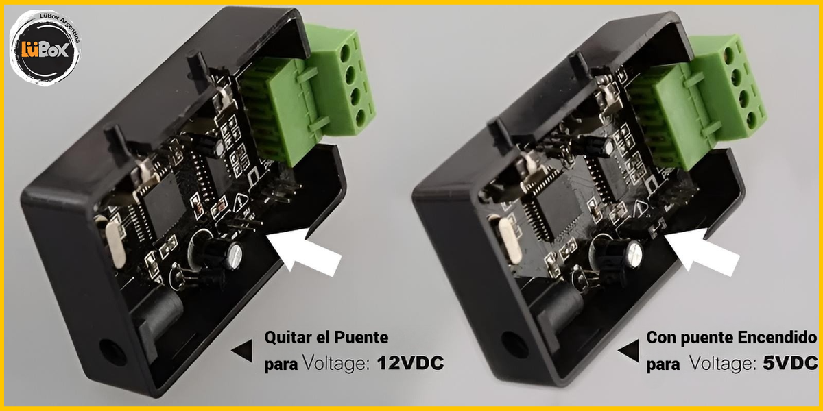 El puente ajustable (jumper) lo hace adecuado para fuentes de alimentación de 5Vdc y 12Vdc.