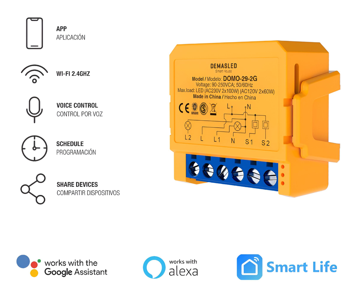 Este dispositivo es un módulo controlador de intensidad de luz (Dimmer) de doble canal que se conecta al cableado eléctrico (requiere neutro) y a los interruptores de pared existentes. Convierte dos circuitos de luces LED dimables conectadas en un sistema Smart controlable por WiFi (2.4GHz) a través de la app Smart Life, permitiendo regular cada salida de forma independiente.