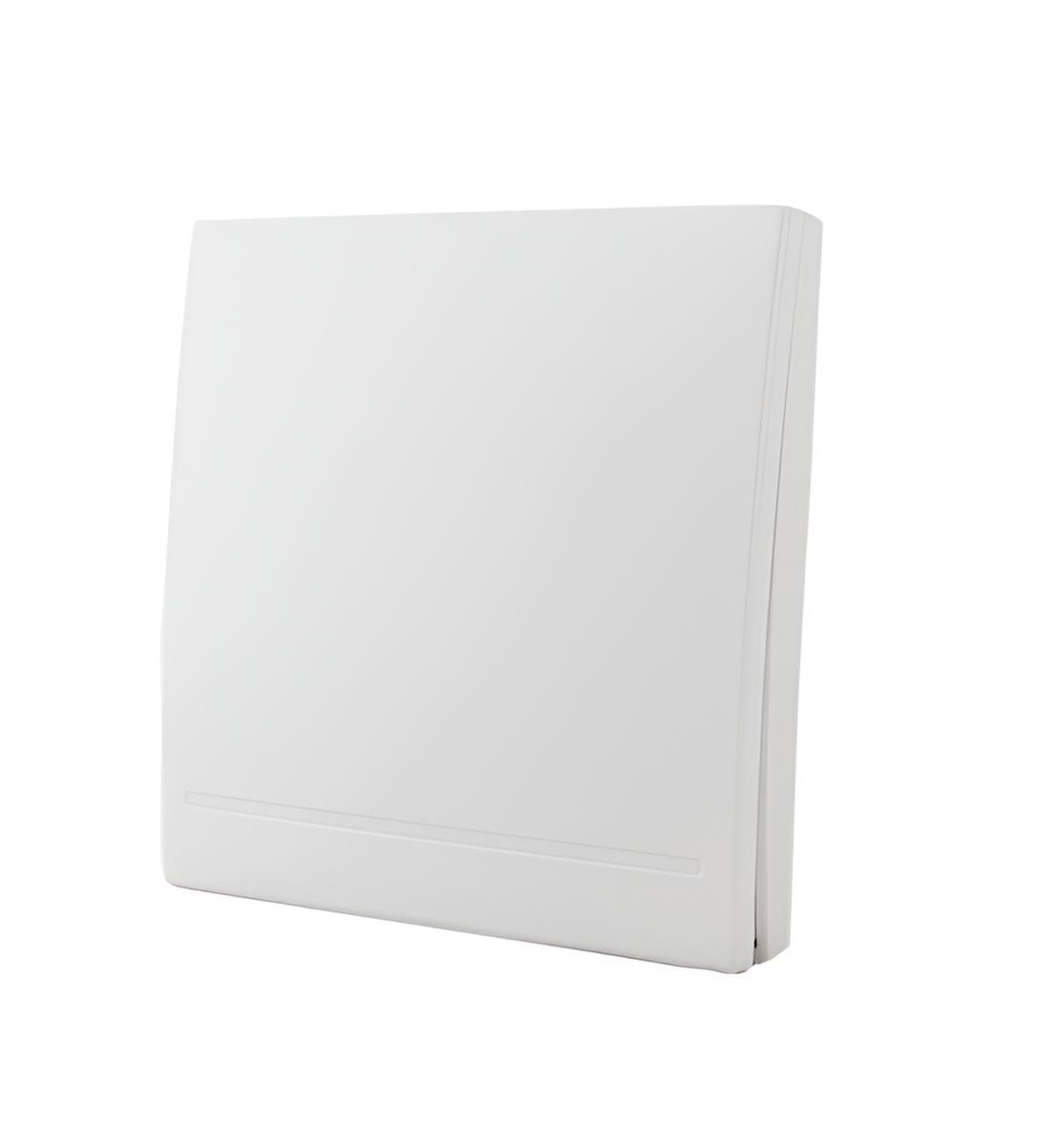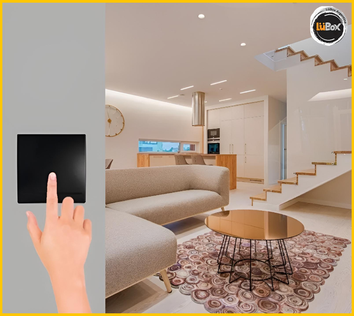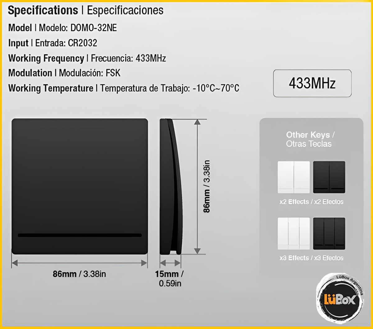 Es un interruptor de pared de 1 botón que no requiere cableado eléctrico. Utiliza una batería CR2032 y la tecnología de Radio Frecuencia (433MHz) para enviar comandos a un Smart Switch receptor compatible (como el DOMO-18-RF). Permite encender, apagar o controlar un dispositivo inteligente de forma remota y flexible, sin tener que romper paredes.