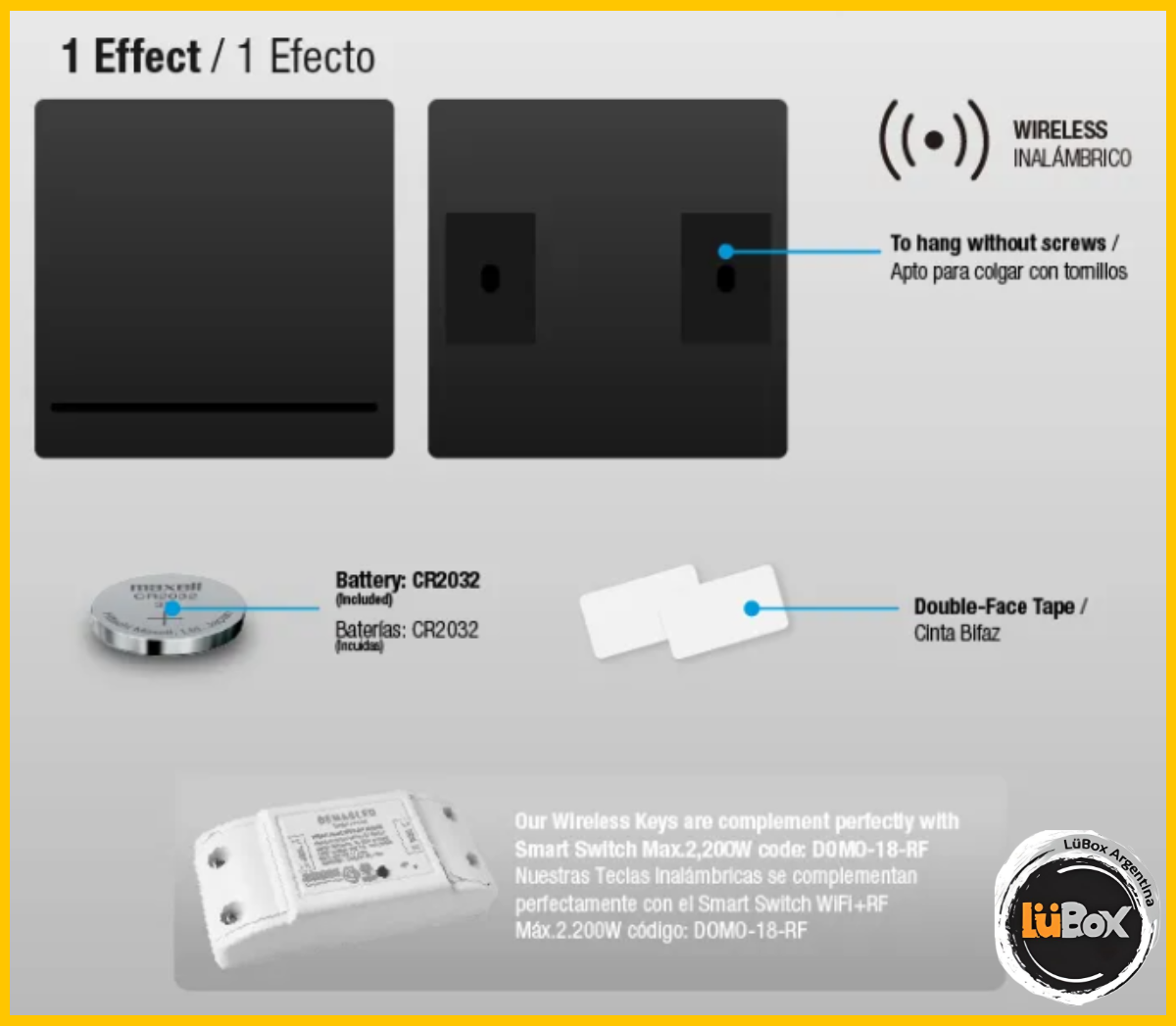 Instalación sin cables ni obras: La tecla Inalámbrica RF de 1 Efecto te permite agregar un punto de control de iluminación en cualquier superficie (pared, madera, vidrio) de tu hogar. Funciona por radiofrecuencia (433MHz) y es ideal para encender/apagar o crear escenas domóticas cuando se vincula a un receptor Mini Smart Switch WiFi+RF (DOMO-18-RF). Funciona con una batería CR2032, ofreciendo comodidad y portabilidad total.