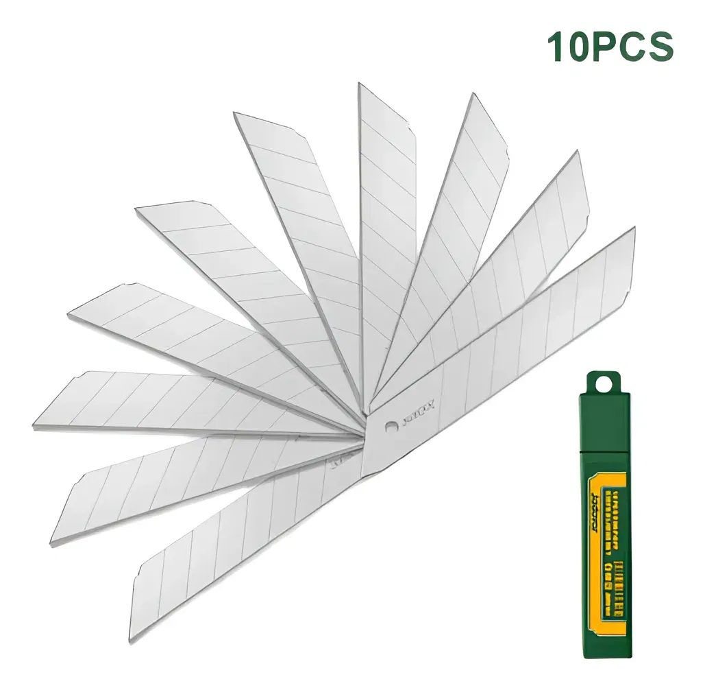 Este paquete incluye 10 hojas de alta calidad de 18 mm con 8 cortes cada una, ideales para cortes precisos y detallados. Diseñadas para adaptarse a cutters plegables de 18mm, estas hojas son una elección inteligente para profesionales y aficionados. Presentación en blister plástico.