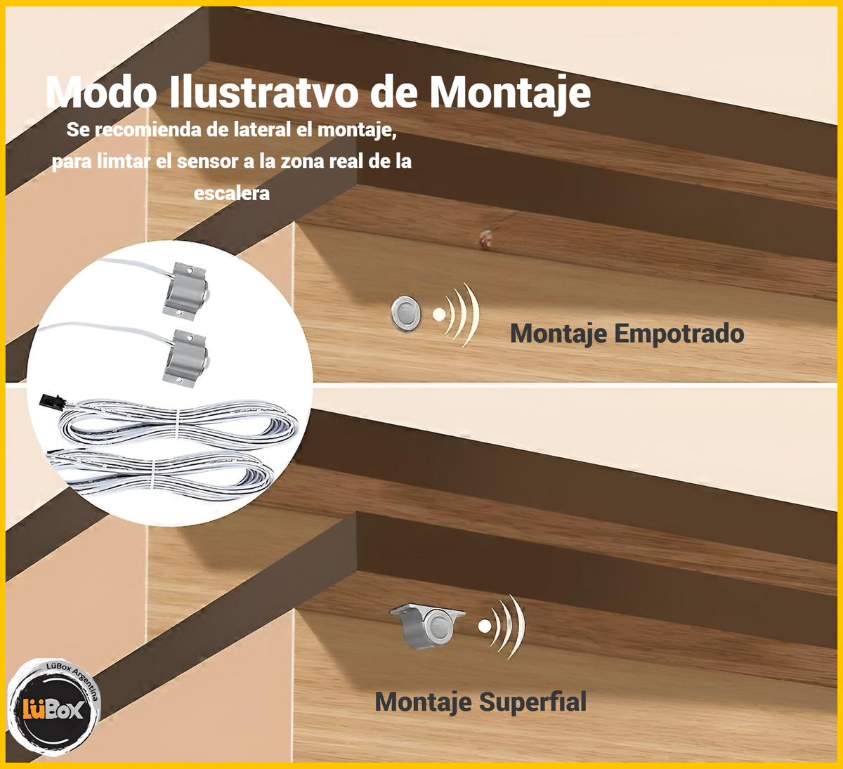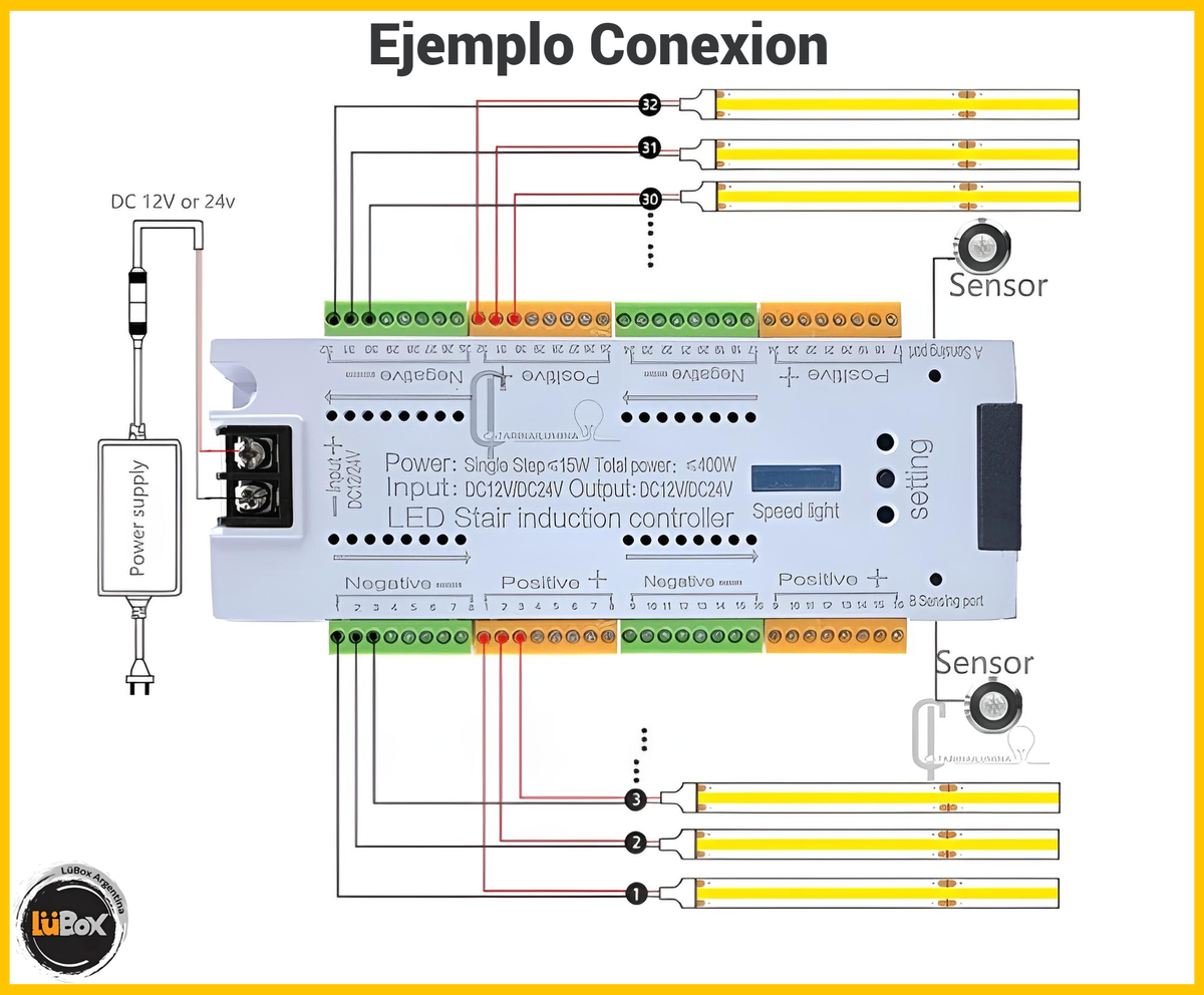 El adaptador proporciona energía al sensor, al controlador y a cada luz led. Instala el led liht según el orden de los pasos.