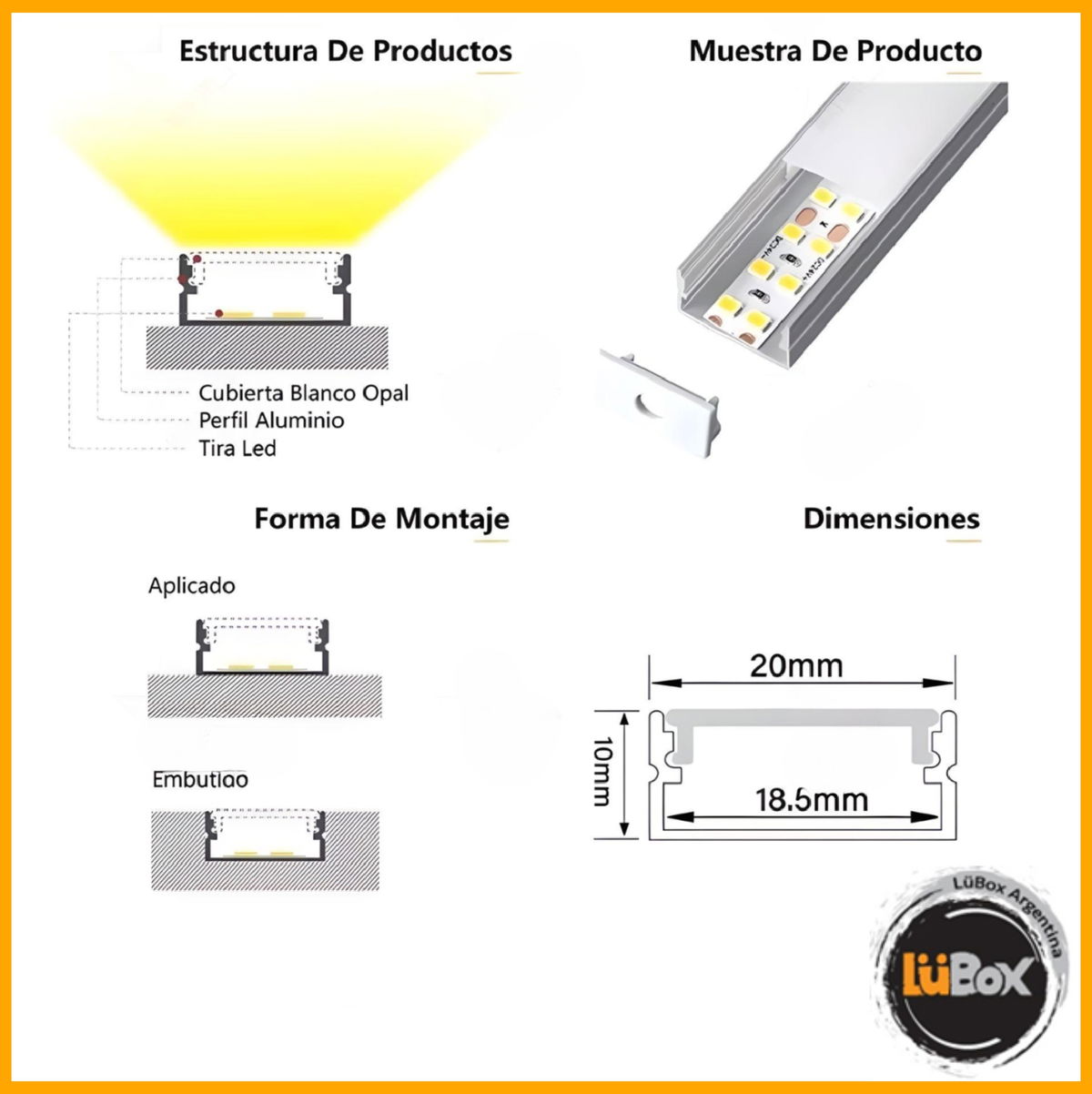 Perfil 200cm Aluminio Natural para tira led Aplicar 20*10Mm